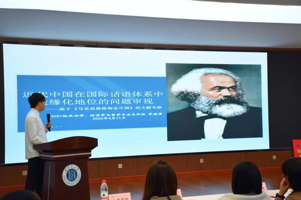 2021级政治学、经济学与哲学专业本科班的茅威涛以“近代中国在国际话语体系中边缘化地位的问题审视——基于《马克思恩格斯论中国》的文献考察”为题,从文章基本脉络、研究内容分享以及部分节选内容展开详细叙述。
