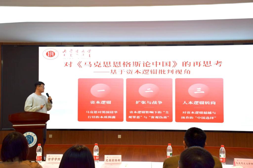 2022级哲学专业本科班的王慧韬以“对《马克思恩格斯论中国》的再思考——基于资本逻辑批判视角”为题,从资本逻辑、扩张与战争、人本逻辑三个方面展开深入剖析。