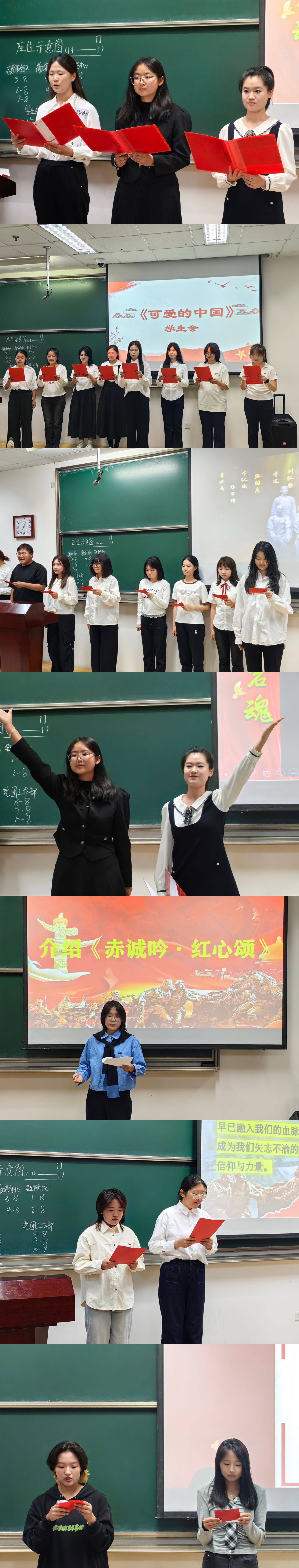 学生事务中心诵读《赤诚吟·红船颂》,讲述南湖红船的故事,紧扣“赤诚”二字;学生会演绎《可爱的中国》,用方志敏的文字表达青年对祖国的热爱;党团工作部诵唱《红岩魂》,讲述江姐狱中绣红旗的故事,展现了革命先烈的爱国情怀;融媒体中心通过《铭记前行》,用声音回顾历史、展望未来;青年志愿者服务队从南陈北李,相约建党的故事说起,诵读《红船颂》,表现担当精神。