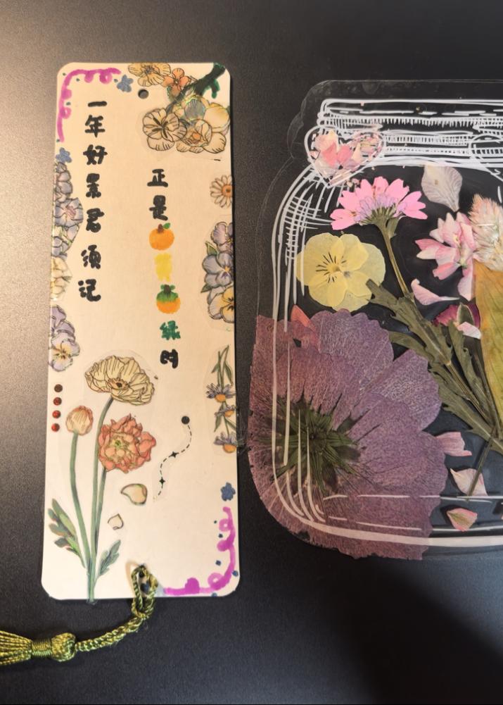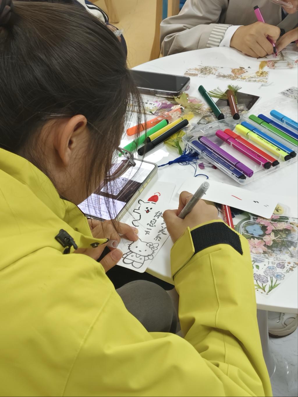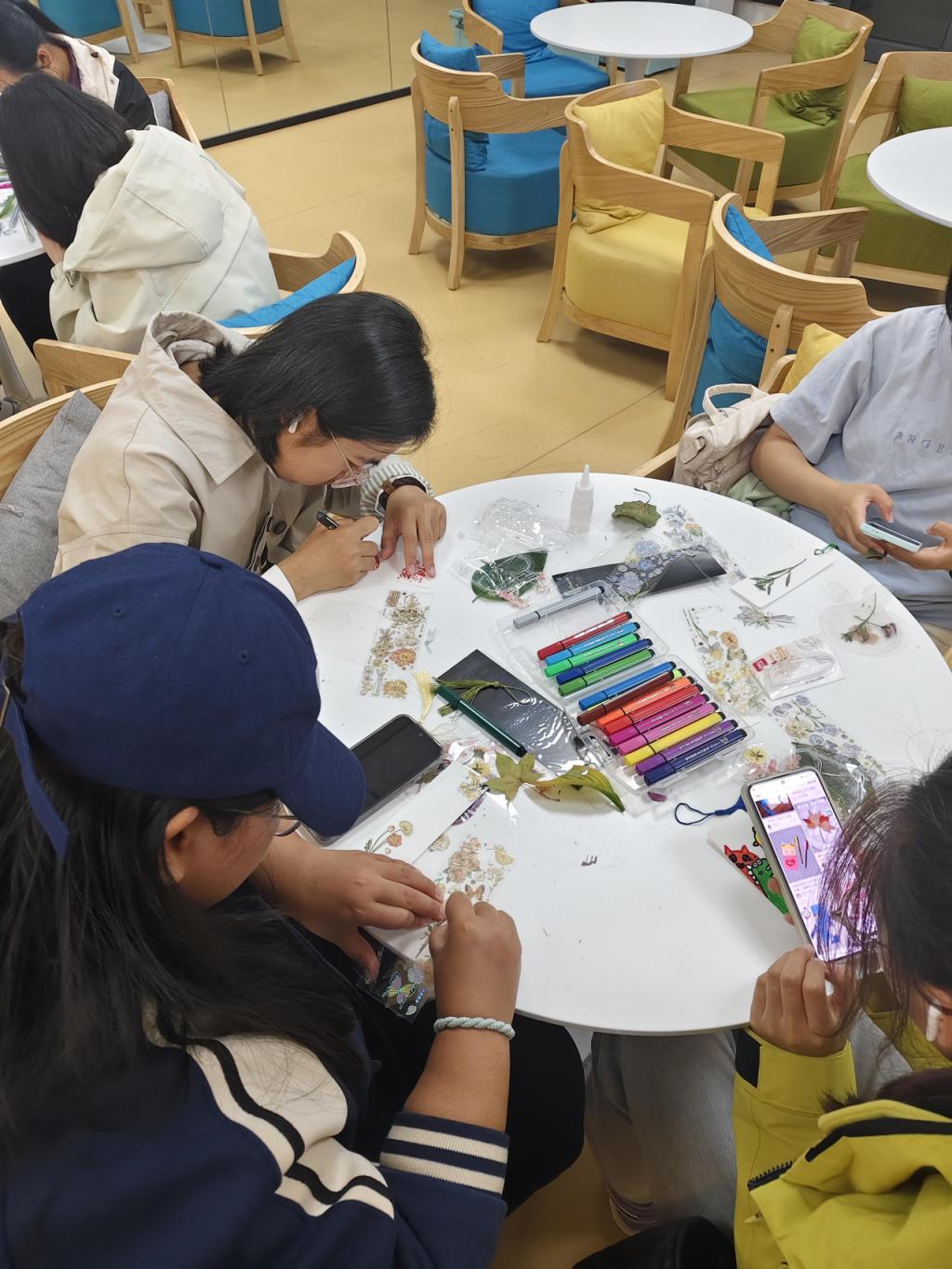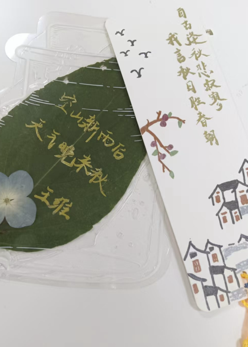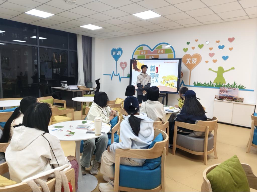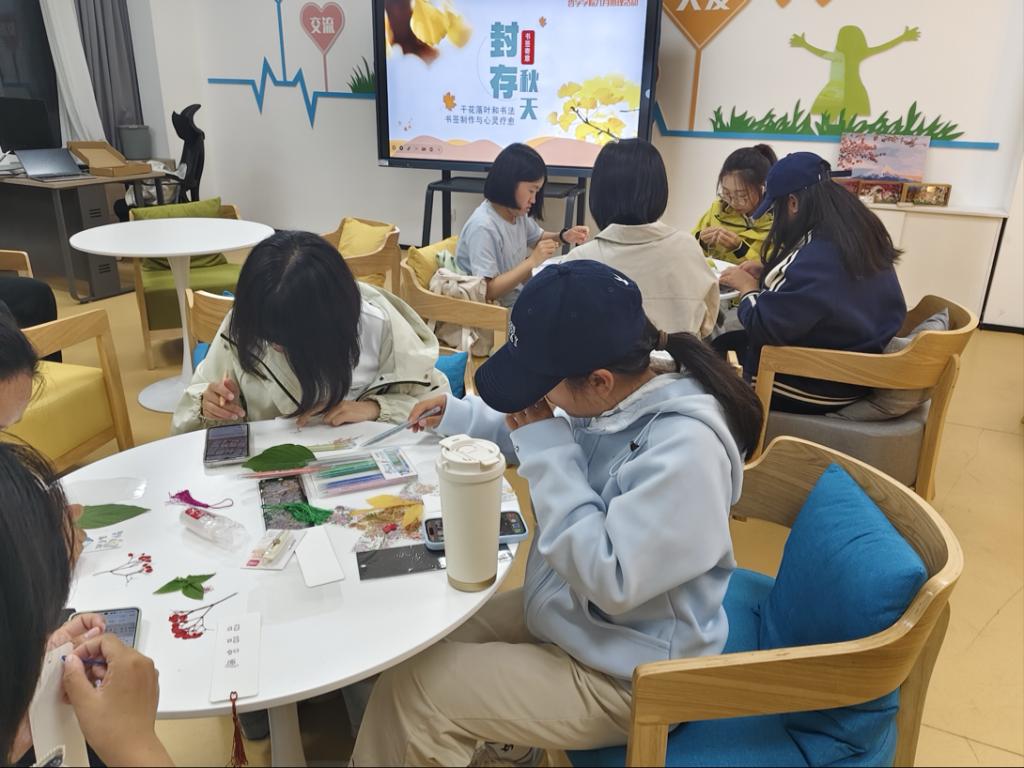 书签初成,温暖的分享环节如约而至。大家轮流展示作品,袒露心底的声音:“这片叶子像团火,我想让它提醒自己,就算季节变冷,内心也要保持热情。”“我的设计很简单,就想留住秋高气爽的明朗,学习累时看看,就能舒心不少。”每一段分享,都是一次情绪的表达;每一枚书签,都是一个小小的心理容器。