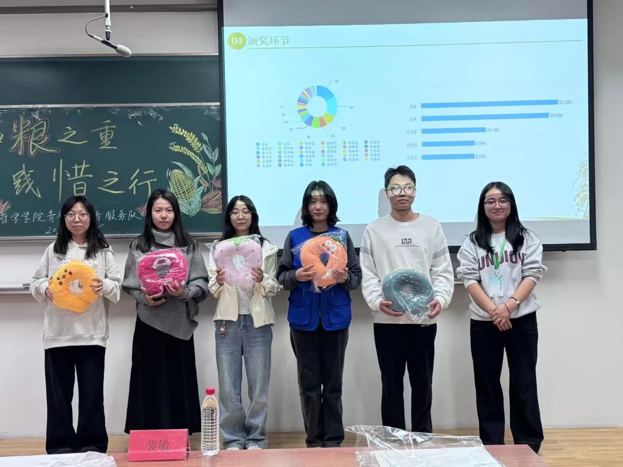 为预热本次活动,学院于五天前发起了“剩饭焕新:让每一粒米都有新可能”的创意作品投票活动,吸引众多学生踊跃参与。在正式活动的结尾,青年志愿者服务队负责人为线上投票票数排名前五的同学颁发了奖品。本次活动以线上展示+投票的方式,有效扩大了活动覆盖面,激发了同学们对粮食再利用的探索兴趣和节粮意识。
