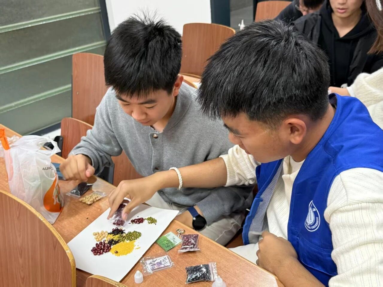 在“粮心手作”杂粮画手工制作环节,志愿者向在场观众展示了不同种类的杂粮,并分别介绍了它们的特点,紧接着以这些谷物为主要材料创作了精美的杂粮画。同学们充分发挥想象力,利用各类杂粮制作出许多精美的作品。这种与粮食的直接互动,不仅让大家亲身感受到其超越食用价值的艺术魅力,更在创作中深化了对自然馈赠的感恩之心与对粒粒粮食的珍惜之情。