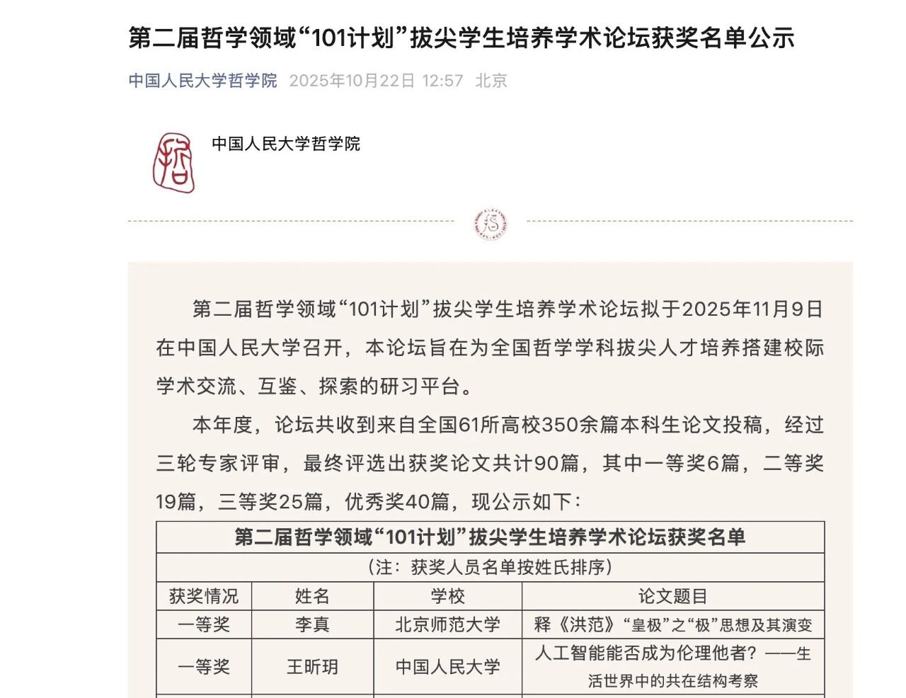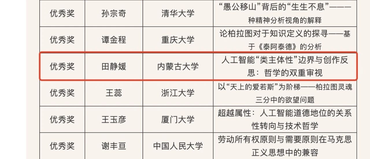 近日,教育部哲学领域“101计划”第二届拔尖学生培养学术论坛评选结果公布。内蒙古大学哲学学院2024级文史哲基地班哲学方向本科生田静媛,凭借论文《人工智能“类主体性”边界与创作反思:哲学的双重审视》获得优秀奖。田静媛是全国民族地区高校中此次获奖的唯一学生,体现了一定的学术能力。
