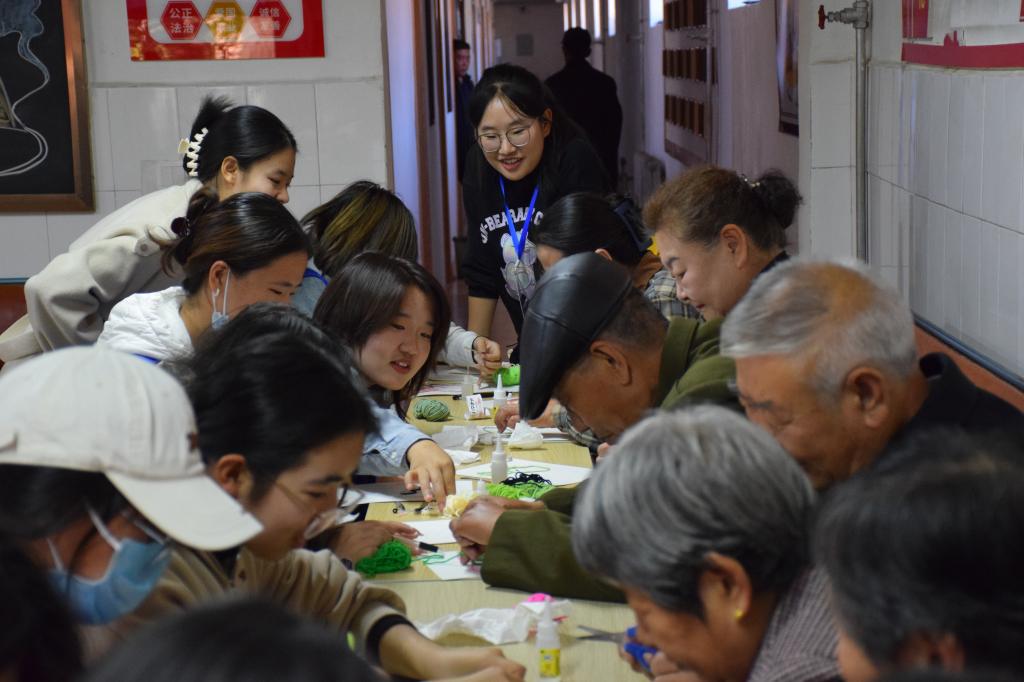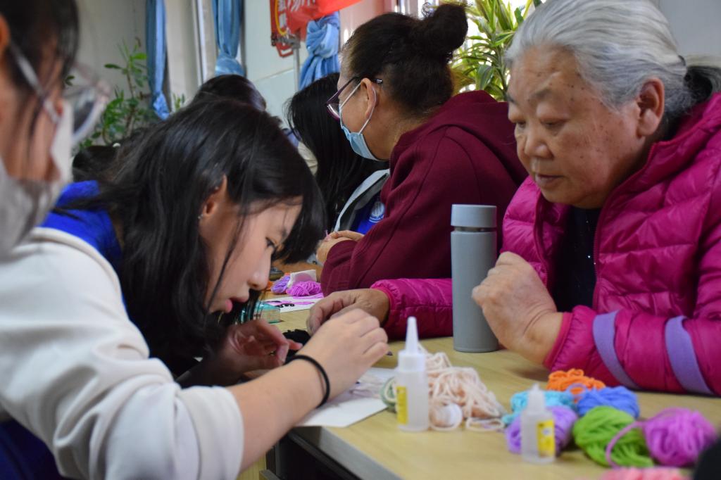 毛线画创作活动温馨进行时,志愿者王焕然、宫赫阳、周婧等的歌声轻轻响起。《酒醉的蝴蝶》《奢香夫人》等多首经典老歌婉转悠扬,志愿者们并肩合唱让人倍感温暖。在音符跳动中,唤醒岁月沉淀的记忆;在歌声交融中,传递跨越代际的敬意。毛线的细腻纹理与旋律的温暖节奏彼此呼应,老人们在亲手创作与互动欢歌中,沉浸于社会的关怀与节日浓浓的温情里。