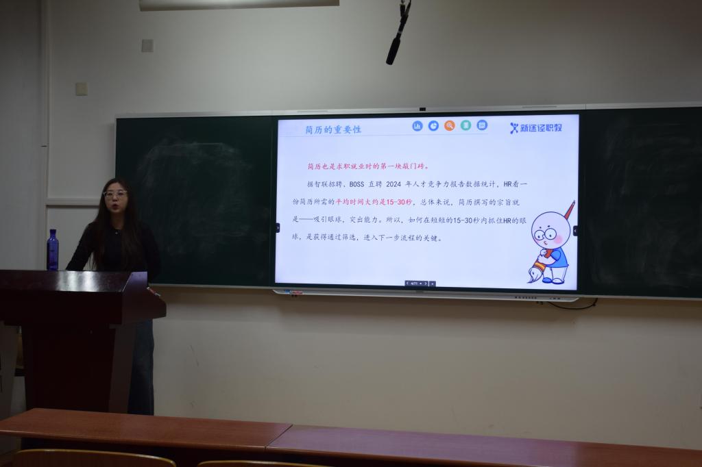 在面试礼仪与实战技巧讲座中,梦琪老师拆解礼仪核心、答题技巧、实战模拟三大模块。她结合简历制作要点强调贴合实际撰写,实习经历、技能证书、自我评价是关键。她通过“找模板、做调整、填信息、精匹配”的流程,说明简历需参考模板、优化格式、填充内容,再按企业需求微调,助力学子打磨贴合岗位的简历。