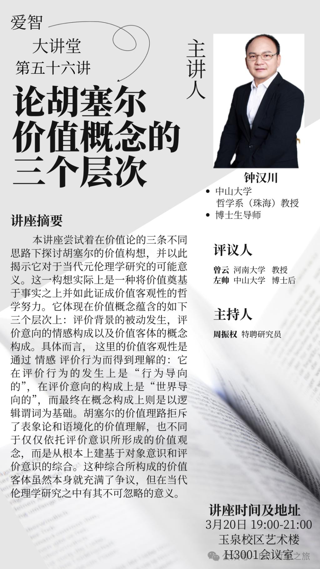 钟汉川,中山大学哲学系(珠海)教授,博士生导师;主要从事外国哲学、现象学和伦理学等方面的教学和科研工作;发表论文《反思、情感与规范性——从胡塞尔到萨特的价值现象学思路》,出版专著 《现象学对伦理学的奠基:以质料先天主义为起点的舍勒伦理学研究》、译著《对话与责任——向后传统道德转化的问题》等,主持国家社科基金项目2项、教育部基金项目3项。