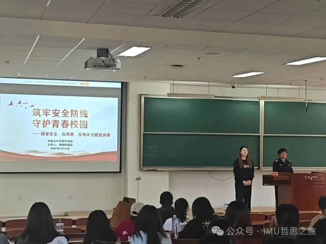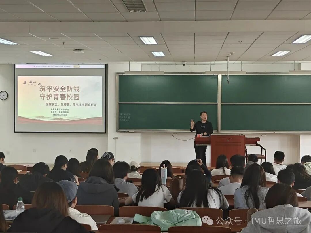 为切实增强全院学生国家安全意识,筑牢校园安全思想防线,引导青年学子树立总体国家安全观,守护平安和谐青春校园,哲学学院于4月16日15:00在卓越楼阶2B成功举办“筑牢安全防线 守护青春校园”国家安全主题宣传讲座。哲学学院党委书记周国权、专职辅导员裴敏参与本次讲座,本次讲座特邀鲁晓辉警官主讲,围绕国家安全、反邪教、防范电信网络诈骗等内容开展专题宣讲。
