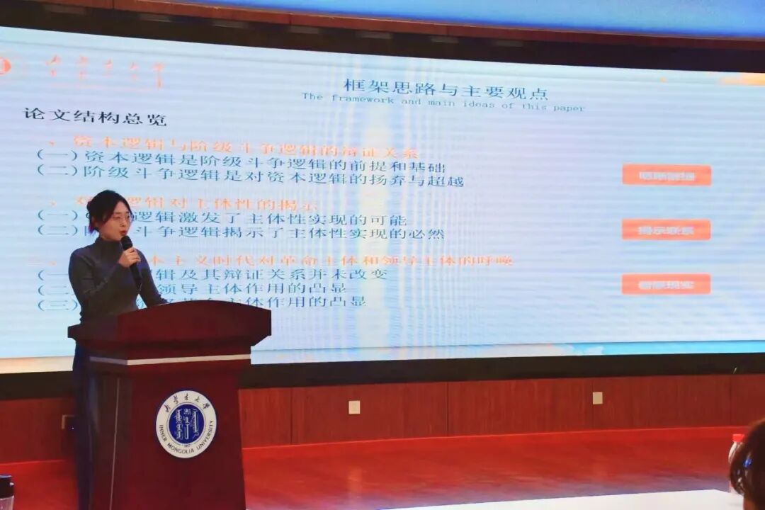 内蒙古大学2024级文史哲基地班李柏琳则以《共产党宣言》为切入点,针对学界研究不足,创新性构建四维文明新框架,探讨我国现代化进程对经典文明理想的实践与升华。